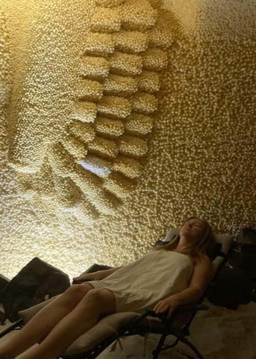 As you enter, the salt cave's stillness and dim lighting invites sensory exploration as bare feet and toes welcome the texture of 3000 pounds of Baja Gold Sea Salt to rake, meditate, and create a Salt Angel in before reclining to nap.